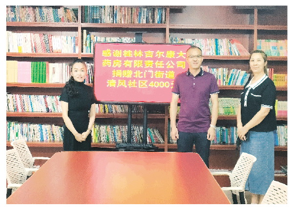 桂林市吉尔康大药房志愿服务队不仅为居民开展义诊服务,还为社区捐款捐物。