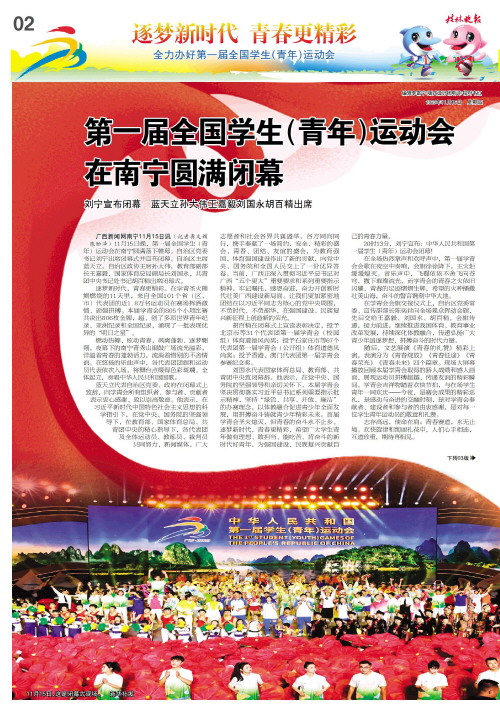 在南宁圆满闭幕 刘宁宣布闭幕 蓝天立孙大伟王嘉毅刘国永胡百精出席   广西新闻网南宁11月15日讯(记者龚文颖 陈贻泽)11月15日晚,第一届全国学生(青年)运动会在南宁圆满落下帷幕。自治区党委书记刘宁出席闭幕式并宣布闭幕。自治区主席蓝天立,自治区政协主席孙大伟,教育部副部长王嘉毅,国家体育总局副局长刘国永,共青团中央书记处书记胡百精出席闭幕式。