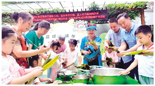 ↑社区居民和前锋幼儿园师生一起过端午。(社区供图)