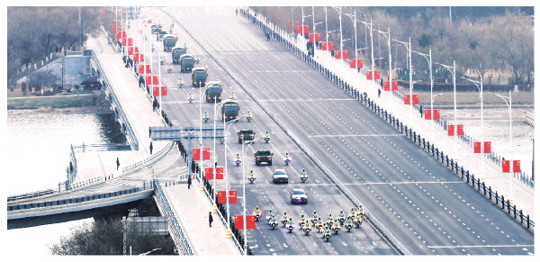 23日,运送志愿军烈士遗骸的车队经过沈阳青年大街。新华社发