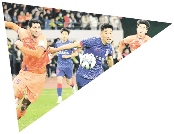 ↓25日,上海申花队球员与山东泰山队球员在比赛中拼抢。 新华社发