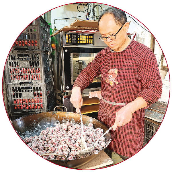 “山楂也要先挑选,把不好的果子挑出来,剩下的进行清洗、晾干后使用。”挑好山楂后,他向一口大锅中加入了白砂糖,等到白砂糖熬成糖浆后,再将已经晾干的山楂倒入其中。经过两三分钟的翻炒、搅拌,冷却的糖浆逐渐凝固并均匀地包裹在山楂表面,山楂雪球也就制作完成了。