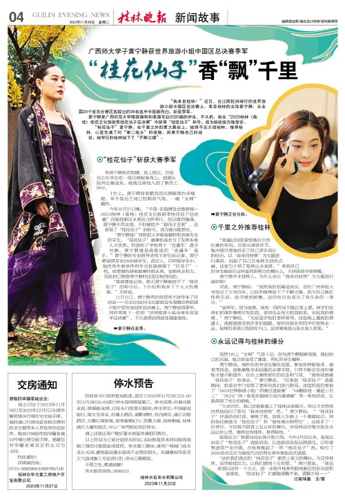 今年10月17日晚,“中国-东盟博览会旅游展—2023桂林(临桂)桂花文化旅游季桂花仙子总决赛”在临桂新区水系状元桥举行,经过激烈角逐,黄宁静不负众望,不但被授予“最佳才艺奖”,还获得了“桂花仙子”的称号,成为城市推荐官。