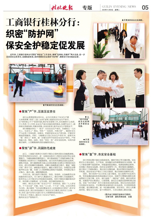 近年来,工商银行桂林分行聚焦“保安全”工作目标,着眼“防事故、防案件”两大任务,进一步压实安全主体责任,完善制度体系,筑牢保障安全运营的“防护网”,确保全行安全稳定运营。