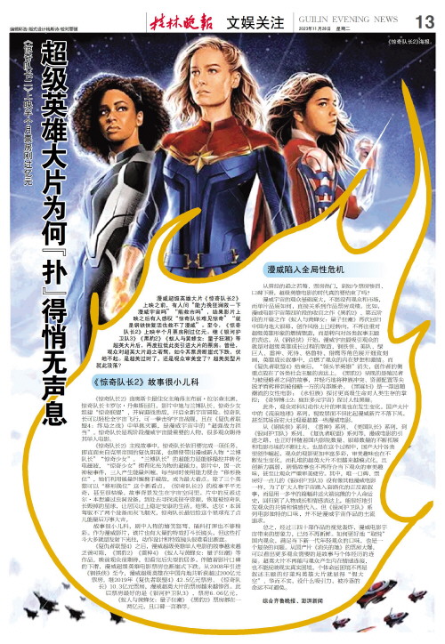 总之,经过三四十部作品的视觉轰炸,漫威电影宇宙带来的想象力,已经不再新鲜。如何更好地“取悦”国内观众,满足当下新一代年轻观众的口味,也是一个复杂的问题。从国产片《消失的她》的票房大爆,可以看出更多观众需要的是故事与个体经历的连接。超英大片不再能与观众产生内在情感连接,也不能反映现实真实困境,个体命运困境不再是叙述主题的好莱坞英雄大片就显得“假大空”、华而不实,没什么吸引力,被冷落的命运不可避免。