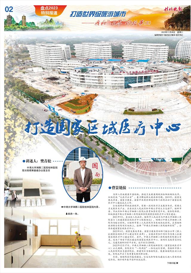 “能参与到这个项目中,为桂林打造世界级旅游城市做出一点贡献,我感到很幸运,也很自豪。”樊青松说,今后院方还计划建设全学科手术中心、体检中心以及与世界级旅游城市相匹配的国际医疗部,将全力以赴把这所医院建成区内乃至全国一流医院的水平,打造现代化医院管理新范式、国家区域医疗中心建设的“桂林样板”,为打造桂林世界级旅游城市提供有力的健康医疗保障。记者唐霁云/文 记者李凯/摄
