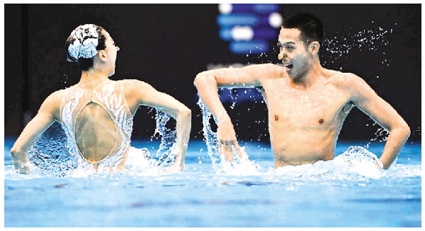 7月22日,石浩玙(右)/程文涛在2023年世界游泳锦标赛花样游泳混双自由自选决赛中。新华社发