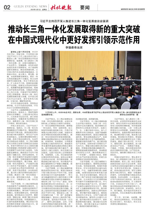 新华社上海11月30日电 中共中央总书记、国家主席、中央军委主席习近平30日上午在上海主持召开深入推进长三角一体化发展座谈会并发表重要讲话。他强调,深入推进长三角一体化发展,进一步提升创新能力、产业竞争力、发展能级,率先形成更高层次改革开放新格局,对于我国构建新发展格局、推动高质量发展,以中国式现代化全面推进强国建设、民族复兴伟业,意义重大。要完整、准确、全面贯彻新发展理念,紧扣一体化和高质量这两个关键词,树立全球视野和战略思维,坚定不移深化改革、扩大高水平开放,统筹科技创新和产业创新,统筹龙头带动和各扬所长,统筹硬件联通和机制协同,统筹生态环保和经济发展,在推进共同富裕上先行示范,在建设中华民族现代文明上积极探索,推动长三角一体化发展取得新的重大突破,在中国式现代化中走在前列,更好发挥先行探路、引领示范、辐射带动作用。