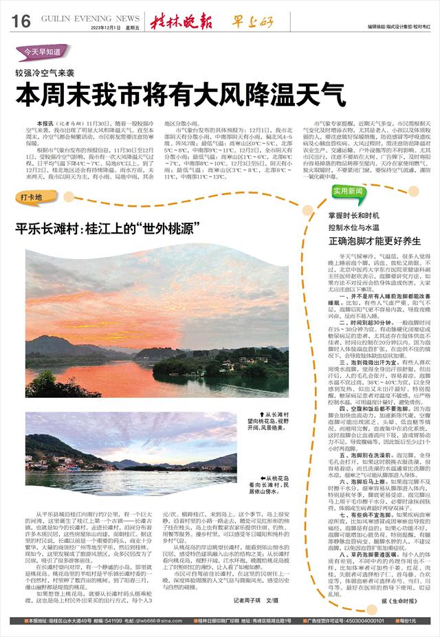 根据市气象台发布的预报信息,11月30日至12月1日,受较强冷空气影响,我市有一次大风降温天气过程,日平均气温下降4℃~7℃、局地8℃以上。到了12月2日,桂北地区还会有持续降温。雨水方面,未来两天,我市以阴天为主,有小雨、局地中雨,其余地区分散小雨。