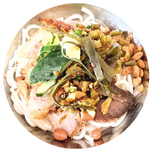 记者点了一份二两米粉,只见老板熟练地冒粉、切肉、加卤水和豆子,整个动作一气呵成。看到案板旁边放着的几大块炸得金黄的锅烧,记者也忍不住让老板切上一点,听着刀切过锅烧清脆的声音,就能知道这锅烧炸得火候正好。