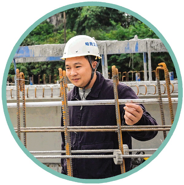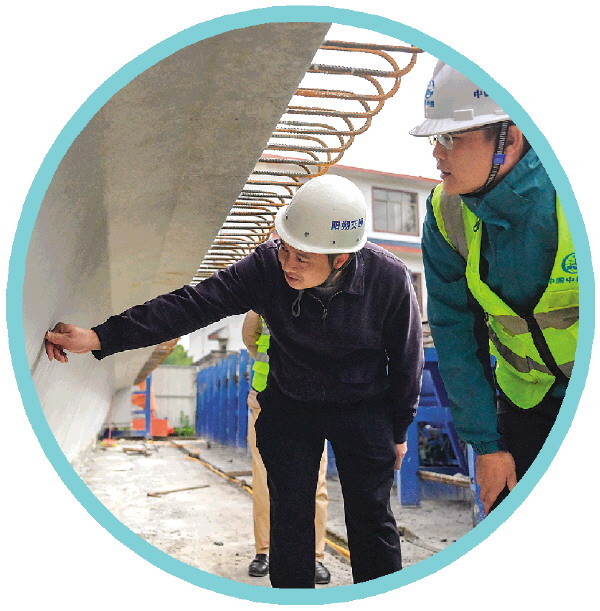 吴顺舟(左)在福利漓江大桥施工现场检查。