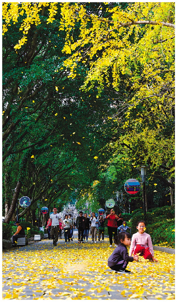 11日,一阵风过后榕湖边的银杏树上片片金灿灿的黄叶飘落下来,满地金黄,引得众多游客驻足欣赏。飘落的黄叶给桂林城增添了一抹冬日的浪漫。记者李凯 摄
