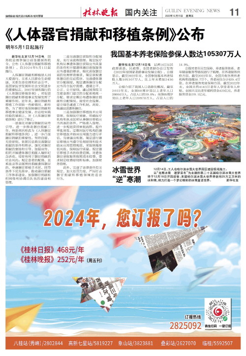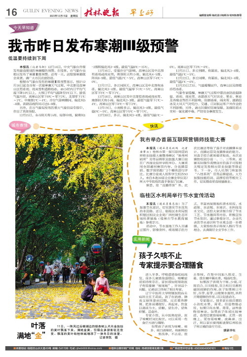 本报讯(记者马翔)12月14日,中央气象台升级发布最高级别的寒潮橙色预警。在桂林,市气象台也相应发布了寒潮Ⅲ级预警。还有一天,这股强寒潮就会来袭,请广大市民注意防范。