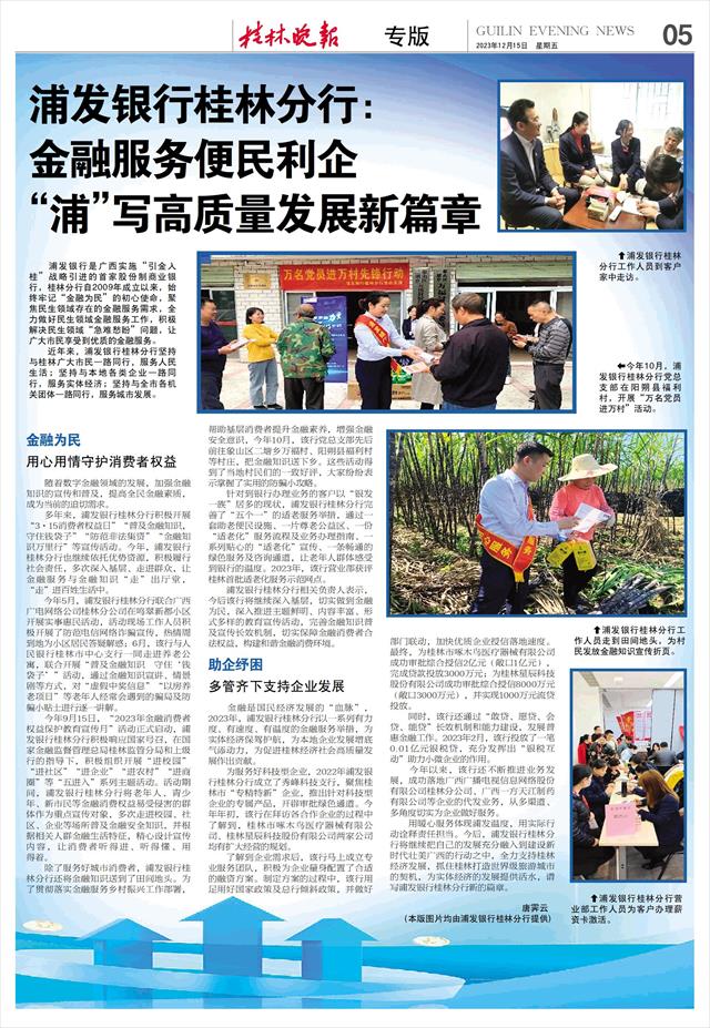 浦发银行是广西实施“引金入桂”战略引进的首家股份制商业银行,桂林分行自2009年成立以来,始终牢记“金融为民”的初心使命,聚焦民生领域存在的金融服务需求,全力做好民生领域金融服务工作,积极解决民生领域“急难愁盼”问题,让广大市民享受到优质的金融服务。