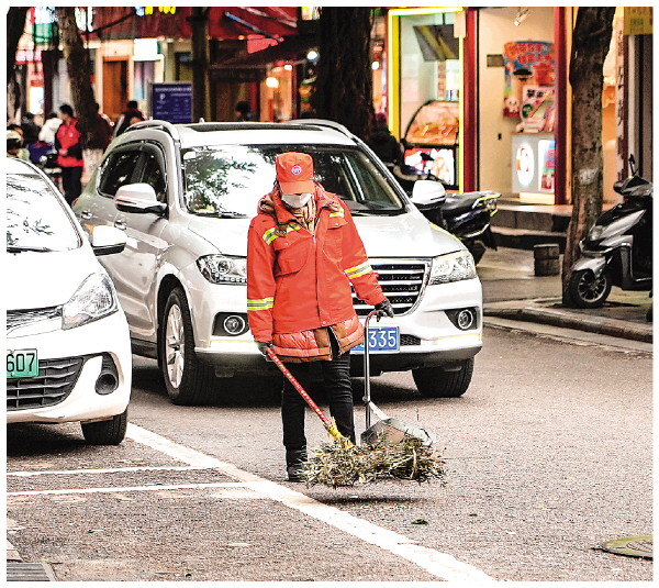 19日在太平路,一位环卫工人穿着厚厚的冬装在清扫街道。本轮强寒潮天气中,环卫工人们顶着寒风坚守岗位,尽心尽责地悉心呵护城市的干净整洁。记者滕嘉 摄