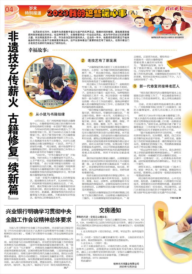 在历史的长河中,古籍作为承载着丰富文化遗产的无声见证,随着时间的推移,面临着逐渐破损和渐渐被遗忘的命运。在这种背景下,古籍修复师这一行业应运而生,成为守护历史记忆的重要力量。何志刚就是其中一员,作为自治区级非遗传承人,过去的一年中,他最感欣慰的莫过于越来越多的年轻人投身于古籍修复的事业中,这不仅意味着这门重要的技艺有了接班人,也预示着这门古老技艺在新时代焕发出了新的生机。