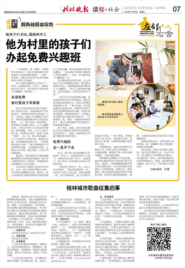 这个免费兴趣班如今已经开了一年多,从最初的两三个孩子,到现在的20多个孩子,曾大军成了家长和孩子们爱戴的“曾老师”。