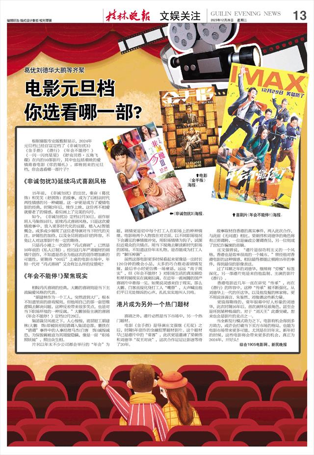 根据猫眼专业版数据显示,2024年元旦档已经官宣定档了《非诚勿扰3》《金手指》《潜行》《年会不能停!》《一闪一闪亮星星》《舒克贝塔·五角飞碟》在内的10部影片,其中也包括重映的爱情青春电影《你的婚礼》。即将到来的元旦档,你会选看哪一部片子?
