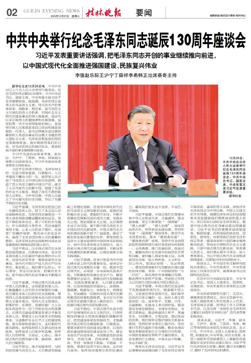 新华社北京12月26日电 中共中央26日上午在人民大会堂举行座谈会,纪念毛泽东同志诞辰130周年。中共中央总书记、国家主席、中央军委主席习近平发表重要讲话。他强调,毛泽东同志是伟大的马克思主义者,伟大的无产阶级革命家、战略家、理论家,是马克思主义中国化的伟大开拓者、中国社会主义现代化建设事业的伟大奠基者,是近代以来中国伟大的爱国者和民族英雄,是党的第一代中央领导集体的核心,是领导中国人民彻底改变自己命运和国家面貌的一代伟人,是为世界被压迫民族的解放和人类进步事业作出重大贡献的伟大国际主义者。毛泽东思想是我们党的宝贵精神财富,将长期指导我们的行动。对毛泽东同志的最好纪念,就是把他开创的事业继续推向前进。