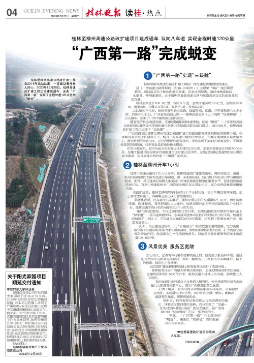 桂林至柳州高速公路改扩建工程自2019年启动以来,一直牵动着桂林人的心。2023年12月26日,桂柳高速改扩建工程正式建成通车,这条“广西第一路”实现了全程时速120公里的“蜕变”。