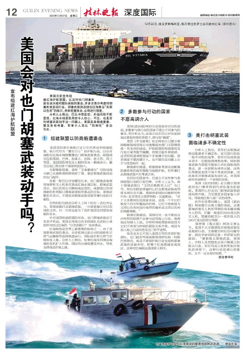 俄罗斯《观点报》网站文章认为,美国不大可能冒险对胡塞武装发动地面行动。文章援引阿拉伯问题专家、政治学家列昂尼德·伊萨耶夫的话说:“要想阻止胡塞武装,美国人、沙特人及其盟友必须开展真正的联合行动。但在乌克兰危机和加沙危机的背景下,这种行动是难以想象的,且不一定会有好结果。”