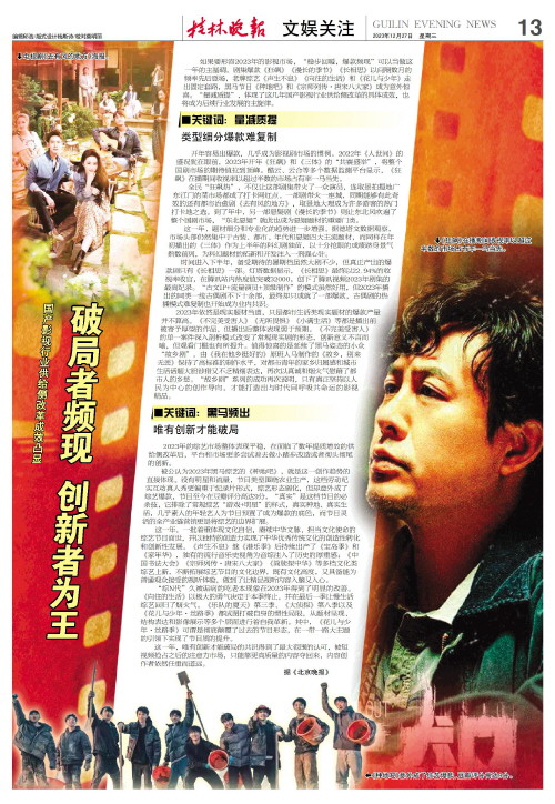 如果要形容2023年的影视市场,“稳步回暖,爆款频现”可以当做这一年的主基调。剧集爆款《狂飙》《漫长的季节》《长相思》以间隔数月的频率先后登场,老牌综艺《声生不息》《向往的生活》和《花儿与少年》走出固定套路,黑马节目《种地吧》和《宗师列传·唐宋八大家》成为意外惊喜。“量减质提”,体现了这几年国产影视行业供给侧改革的具体成效,也将成为后续行业发展的主旋律。