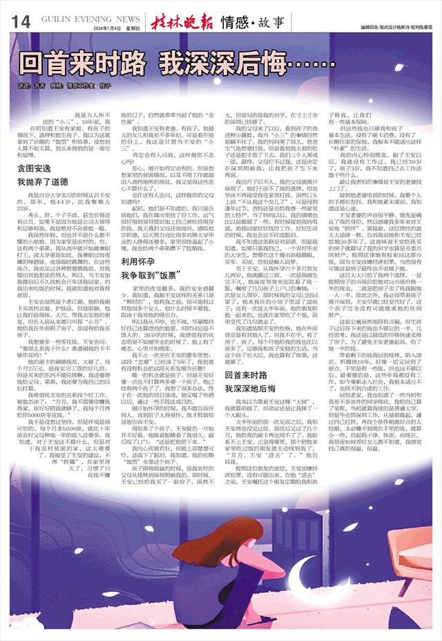 我知道依照王安的性格,他在外面肯定是有其他人了。但我不在乎,有了房子、孩子,每个月他给我的钱也比以前多了,足够我和孩子安稳的生活。当这个孩子长大后,我也算有了依靠,这就够了。