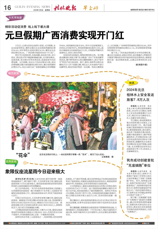 精彩活动促消费 线上线下都火爆 元旦假期广西消费实现开门红   1月2日,记者从自治区商务厅获悉,元旦假期,全区208家零售业、餐饮业重点企业实现销售额同比增长16.4%,其中零售企业同比增长16.2%,餐饮业企业同比增长39.2%。广西消费市场迎来2024“开门红”。