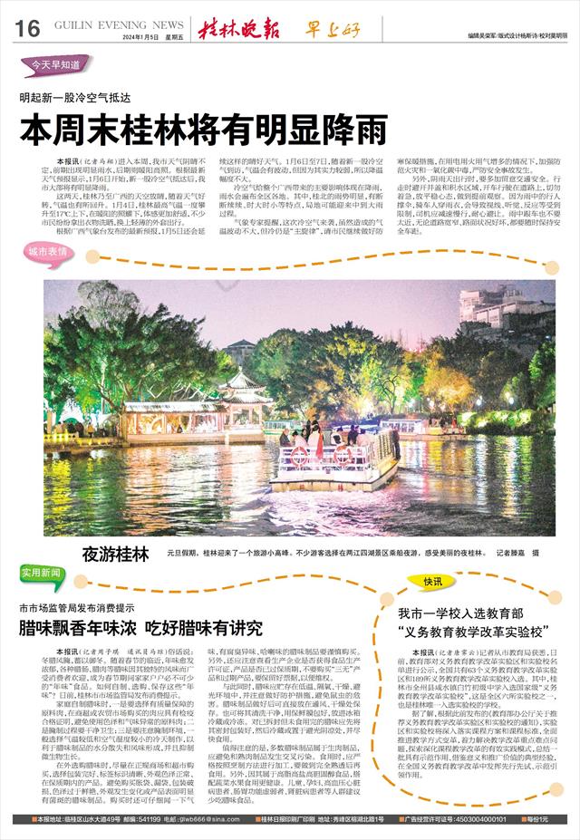 明起新一股冷空气抵达 本周末桂林将有明显降雨   本报讯(记者马翔)进入本周,我市天气阴晴不定,前期出现明显雨水,后期则暖阳高照。根据最新天气预报显示,1月6日开始,新一股冷空气抵达后,我市大部将有明显降雨。