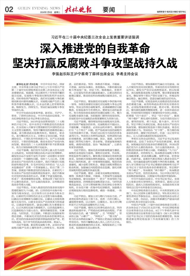 李希在主持会议时指出,习近平总书记发表的重要讲话,总结了全面从严治党的新进展、新成效,深刻阐述党的自我革命的重要思想,科学回答我们党为什么要自我革命、为什么能自我革命、怎样推进自我革命等重大问题,明确提出“九个以”的实践要求,对持续发力、纵深推进反腐败斗争作出战略部署。讲话高瞻远瞩、视野宏阔、思想深邃、内涵丰富,是新时代新征程深入推进全面从严治党、党风廉政建设和反腐败斗争的根本遵循。要深入学习贯彻习近平总书记重要讲话精神和习近平总书记关于党的自我革命的重要思想,坚定拥护“两个确立”、坚决做到“两个维护”,纵深推进全面从严治党、党的自我革命,为以中国式现代化全面推进强国建设、民族复兴伟业提供坚强保障。