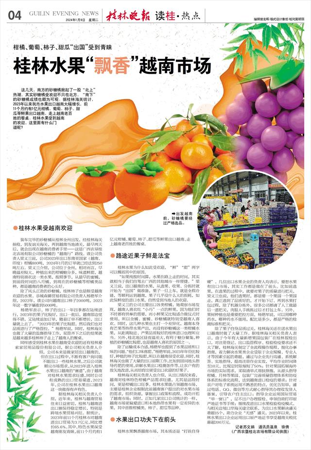 同样感受到桂林水果在越南受欢迎的还有桂林爱索家居用品股份有限公司,据公司相关负责人介绍,公司本来是做家居出口越南的,但在出口过程中,不断有客户询问能不能出口一些桂林水果,之后公司就顺应市场需求,从2023年进入桂林水果出口越南的“赛道”,由于越南对桂林水果需求旺盛,同时公司有成熟的出口贸易渠道,2023年,公司在桂林水果出口越南这一块做得有声有色。