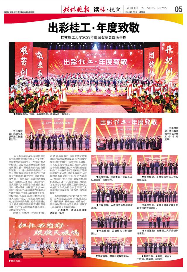 为大力表彰在深入学习贯彻习近平新时代中国特色社会主义思想,全面贯彻落实党的二十大精神,推动学校党的建设和各项事业加快发展高质量发展中涌现出来的先进集体和先进个人,进一步激励全体桂工人深入贯彻落实习近平总书记对广西重大方略要求,解放思想、创新求变,乘势而上、开拓奋进,为建设教育强国、科技强国、人才强国,奋力谱写中国式现代化广西篇章作出新的更大贡献,1月5日晚,桂林理工大学2023年度“出彩桂工·年度致敬”颁奖晚会在该校雁山校区新体育馆盛大上演,学校领导、各界嘉宾、师生代表3000余人齐聚一堂,共同见证典型的荣光,感悟榜样的力量。晚会同步通过线上形式进行高清视频直播和图片直播,约4万人次同时观看晚会盛况,点赞量超30万次。