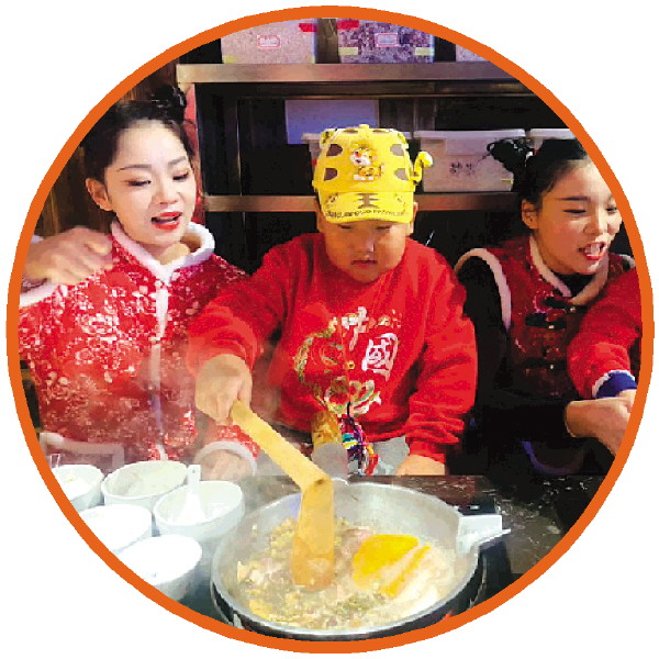 用餐结束后,“小东北虎”还与餐厅工作人员交流互动,共跳广西“科目三”,并一起体验打油茶的乐趣。