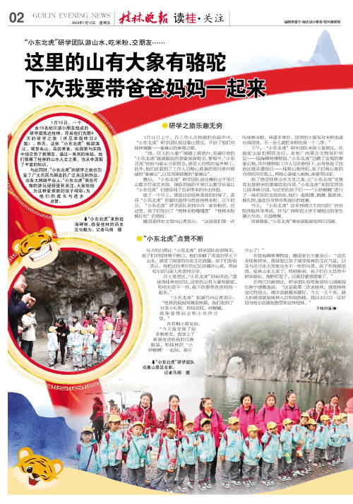 1月10日,一个由15名哈尔滨小朋友组成的研学团抵达桂林,开启他们为期4天的研学之旅(详见本报昨日2版)。昨天,这些“小东北虎”畅游漓江、观赏名山、品尝美食,在探索与实践中结交到了新朋友。通过一系列的体验,他们领略了桂林的山水人文之美,也从中汲取了丰富的知识。