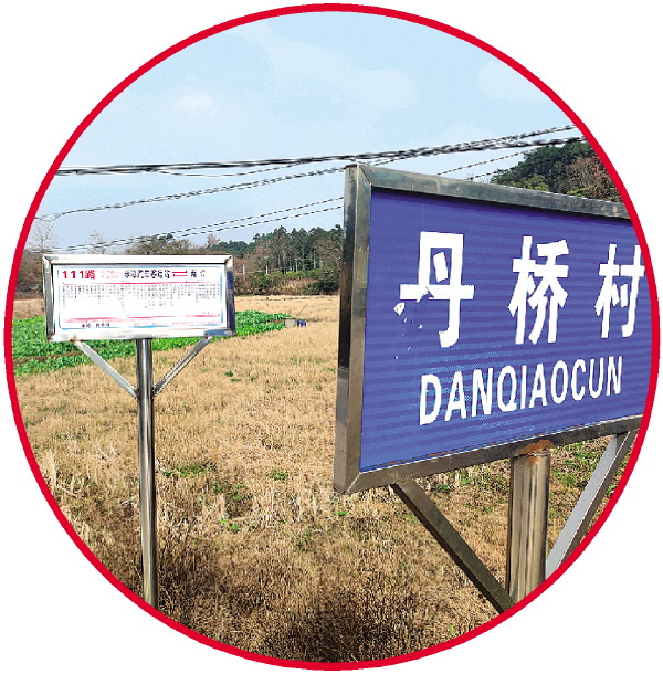 临桂区两江镇高妙村委丹桥村位于357国道旁,村口立着一块111路公交车站牌。