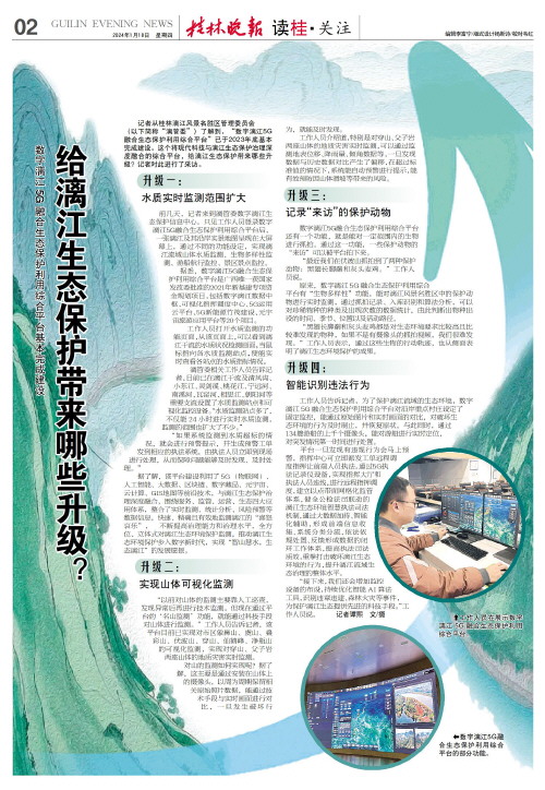 数字漓江5G融合生态保护利用综合平台基本完成建设 给漓江生态保护带来哪些升级?   记者从桂林漓江风景名胜区管理委员会(以下简称“漓管委”)了解到,“数字漓江5G融合生态保护利用综合平台”已于2023年底基本完成建设。这个将现代科技与漓江生态保护治理深度融合的综合平台,给漓江生态保护带来哪些升级?记者对此进行了采访。