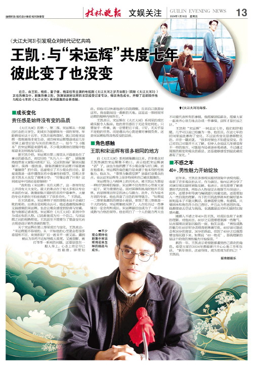 王凯和“宋运辉”一同走过七年,他们相伴相随,几乎可以说已经融为一体。他坦言,在这七年的时间里彼此都有了变化,不过这些变化是潜移默化的,并非一蹴而就。“很多时候也不知道变没变,自己对自己可能并不太了解,但旁人会说这几年感觉有不一样的地方,可能是当局者迷旁观者清。不过通过周围的朋友和观众的看法,还是能够感受到彼此确实都有了变化。”
