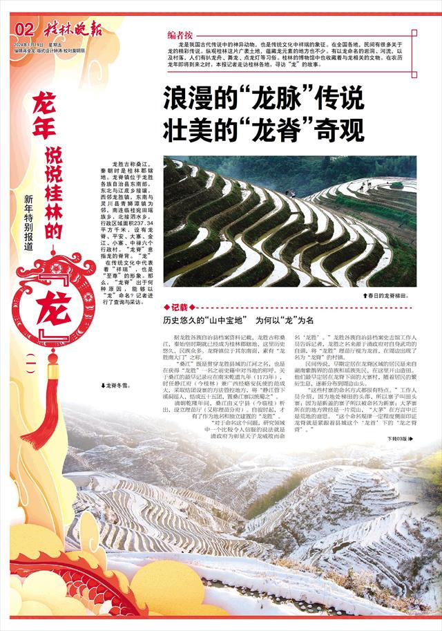 龙是我国古代传说中的神异动物,也是传统文化中祥瑞的象征。在全国各地,民间有很多关于龙的精彩传说。纵观桂林这片广袤土地,蕴藏龙元素的地方也不少。有以龙命名的岩洞、河流,以及村落,人们有扒龙舟、舞龙、点龙灯等习俗。桂林的博物馆中也收藏着与龙相关的文物。在农历龙年即将到来之时,本报记者走访桂林各地,寻访“龙”的故事。
