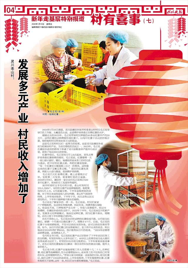 刚刚过去的2023年,毛正花带领村民种植的40多亩红薯丰产约20万斤。这些红薯经过烘烤制作成红薯干,以每斤红薯干25元的价格计算,将给她和村民带来80多万元的收益。