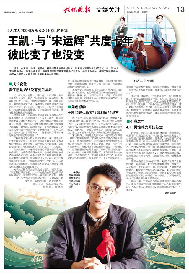 彼此变了也没变   近日,由王凯、杨烁、董子健、杨采钰等主演的电视剧《大江大河之岁月如歌》(简称《大江大河3》)正在热播当中。剧集热播之际,饰演该剧宋运辉的王凯接受记者专访,畅谈角色成长,并聊了这部陪伴他与观众七年的《大江大河》系列剧集的全新感触。