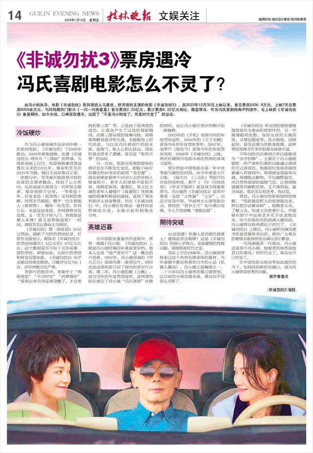 冯氏喜剧电影怎么不灵了?   由冯小刚执导,电影《非诚勿扰》系列原班人马葛优、舒淇领衔主演的电影《非诚勿扰3》,自2023年12月30日上映以来,首日票房2436.9万元,上映7天总票房6000余万元。与同档期热门影片《一闪一闪亮星星》首日票房2.25亿元、累计票房6.22亿元相比,颇显惨淡。作为冯氏喜剧经典IP的续作,在上映前《非诚勿扰3》备受期待,如今市场、口碑双双遇冷,出现了“不是冯小刚变了,而是时代变了”的议论。