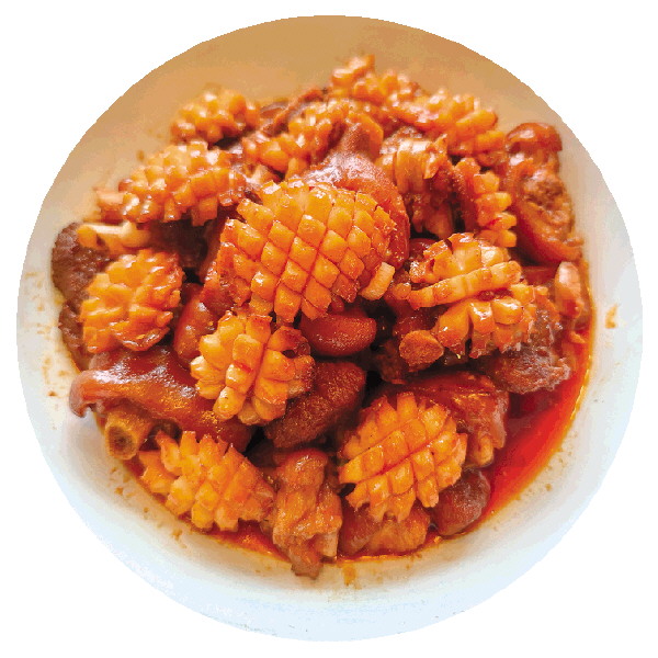 此菜中,切好的鲍鱼制作出来后形似龙鳞,猪脚又有行走的意思,故取名龙行天下。