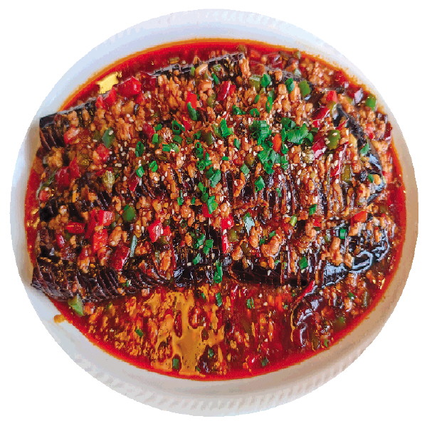 把茄子打花刀,切成一段一段但是底部连接。茄子切好后全部裹上一层薄薄的生粉,放入油锅里炸至外香里嫩,出锅控油备用。酱汁方面,先把肉末(约二两)炒香炒散备用,再把青红辣椒粒、葱粒、姜粒、大蒜粒、豆瓣酱、干妈酱炒香,把肉末加入混炒。之后加入高汤、鸡精味精(约8克),生粉水勾芡,加入辣椒油、胡椒粉、香油,收汁后把酱汁淋到茄子上,撒上葱花、芝麻即可。