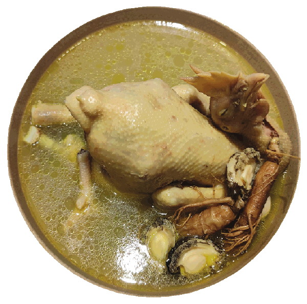 配料:长白山晒参、鲍鱼、土鸡、盐、味精、鸡粉等。