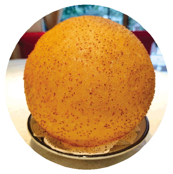 麻团(油堆)是桂林传统小吃,在桂林大街小巷几乎都能吃到。这道菜的灵感就来源于油堆,欣桂厨经过创新改良,把油堆从小变大,内部也变成了空心。从外部看起来有篮球那么大,金光闪闪,犹如一颗龙珠。