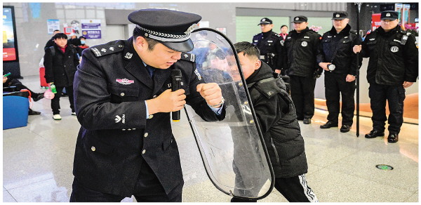 27日,桂林站候车室一个小朋友在铁路民警的邀请下体验民警使用的装备,并与警察叔叔进行了一场“比试”。记者滕嘉 摄