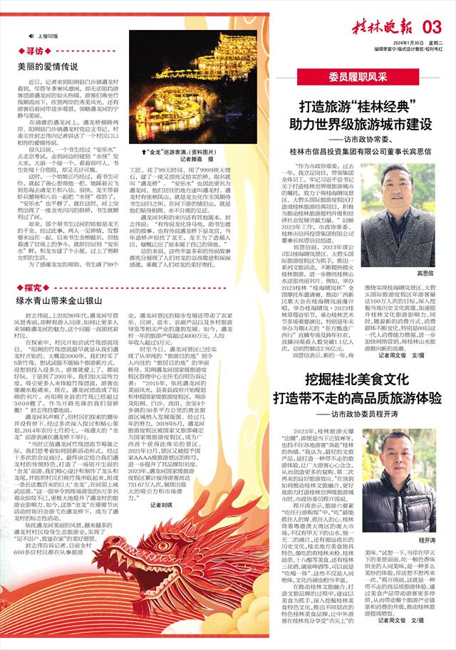 “作为市政协常委,过去一年,我立足岗位,带领集团全体员工,牢记习近平总书记关于打造桂林世界级旅游城市的嘱托,致力于将桂海晴岚景区、大碧头国际旅游度假区打造成桂林旅游经典项目,积极为推动桂林旅游提档升级和经济社会发展贡献力量。”回顾2023年工作,市政协常委、桂林市信昌投资集团有限公司董事长宾恩信总结道。