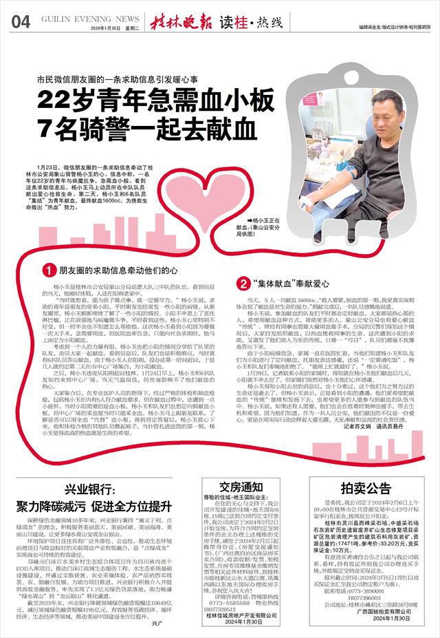1月23日,微信朋友圈的一条求助信息牵动了桂林市公安局象山骑警杨小玉的心。信息中称,一名年仅22岁的青年与病魔抗争,急需血小板。看到这条求助信息后,杨小玉马上动员所在中队队员献出爱心抢救生命。第二天,杨小玉和6名队员“集结”为青年献血,最终献血1600cc,为挽救生命做出“热血”努力。