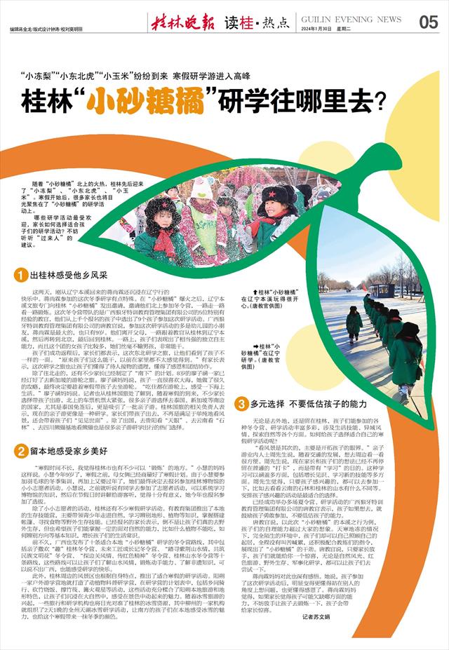 随着“小砂糖橘”北上的火热,桂林先后迎来了“小冻梨”、“小东北虎”、“小玉米”。寒假开始后,很多家长也将目光聚焦在了“小砂糖橘”的研学活动上。