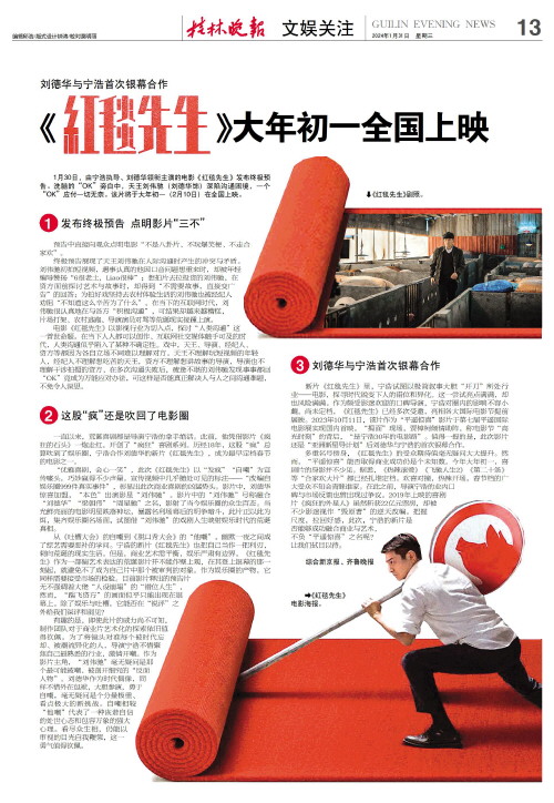 刘德华与宁浩首次银幕合作 《红毯先生》大年初一全国上映   1月30日,由宁浩执导、刘德华领衔主演的电影《红毯先生》发布终极预告。洗脑的“OK”旁白中,天王刘伟驰(刘德华饰)深陷沟通困境,一个“OK”应付一切无奈。该片将于大年初一(2月10日)在全国上映。